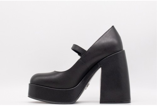 WINDSOR SMITH KISSES-BLK. Queste scarpe con zeppa spessa ridefiniscono le classiche Mary-Jane con le cinturino sulla tomaia e tacco a blocco.