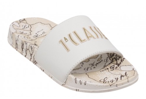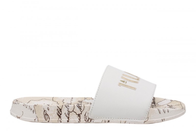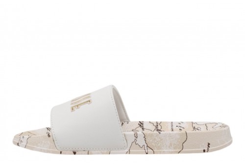 ALVIERO MARTINI SLIDE 2498/0289/W100 WHITE. Slide donna realizzata in 100% pu con maxi fascia logata. Caratterizzata da sottopiede con stampa geo.