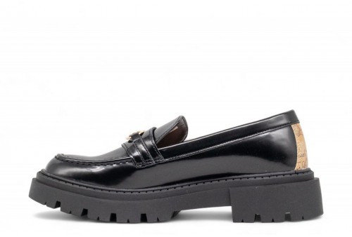 ALVIERO MARTINI MOCASSINO CON MORSETTO 1C. Il tessuto spazzolato regala una texture lucida a questi mocassini, completati dal dettaglio in tessuto effetto nappa stampa Geo Classic sul retro. Dettaglio morsetto logato color oro chiaro. COLORE: NERO