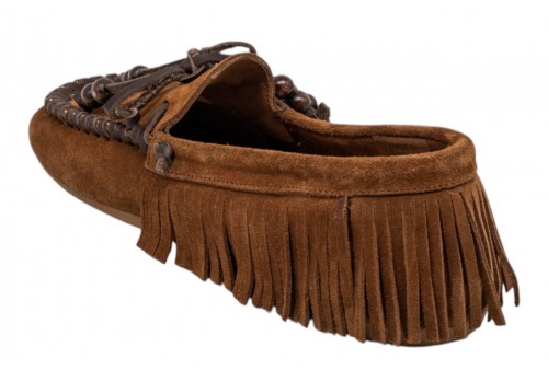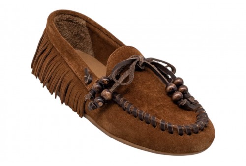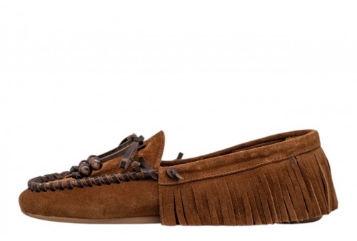 ARIA SHOES mocassino 62405-1 COGNAC. Mocassino donna realizzato in pelle scamosciata impreziosito da frange e perline. Cuciture a contrasto.