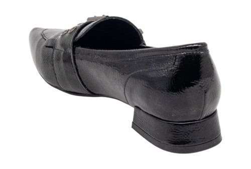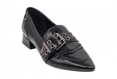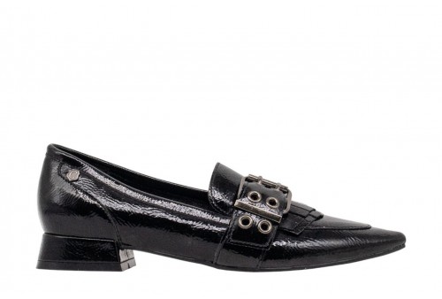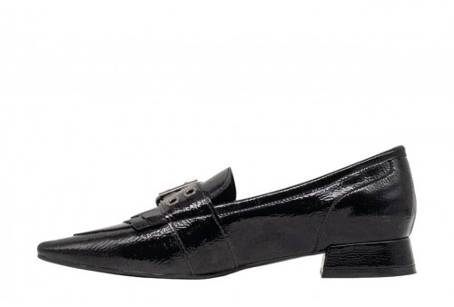 CARMELA MOCASSINO A PUNTA Fatto di vernice. Maschera frontale con fibbia e decorazione a frangie. Suola piatta e antiscivolo e comoda. Soletta rimovibile. NERO