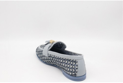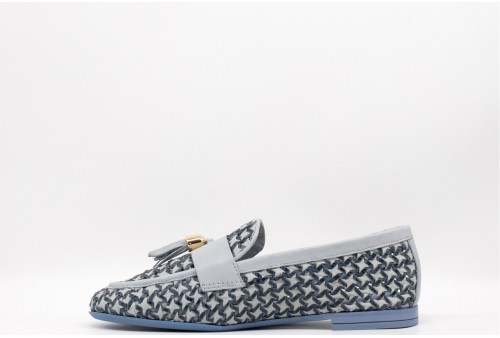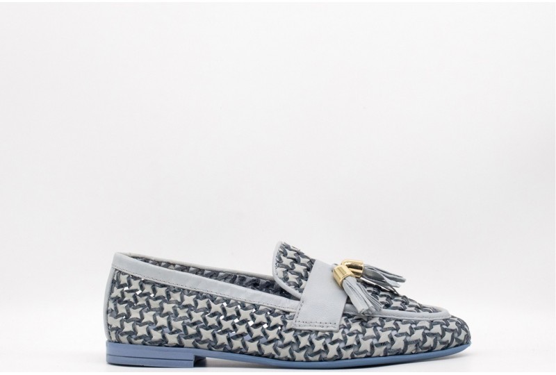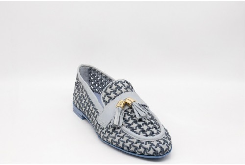 FRAU MOCASSINO INTRECCIATO. Mocassino realizzato in pelle morbidissima e fresca, l'intreccio a trama larga favorisce il passaggio dell'aria. Nappine decorative in pelle. Semifoderato in pelle per rinforzare la punta. Sottopiede, morbido e confortevole, foderato in pelle. Suola super flessibile in TPU con tacco caricato cuoio. Preziosa tomaia realizzata in India, dove manualità esperta e tradizione restituiscono un intreccio elegantemente complesso.COLORE: JEANS