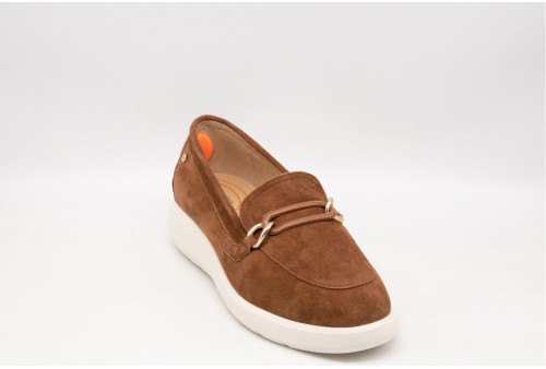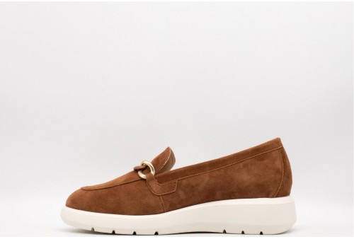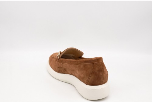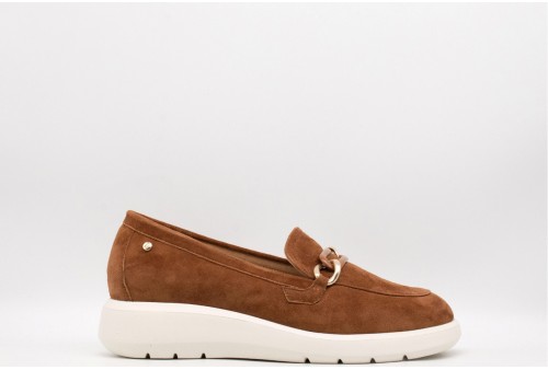 IMPRONTE MOCASSINO CON CATENA. Mocassino realizzato in pelle scamosciata con catena decorativa in metallo dorato sul davanti. Suola flessibile e leggera con zeppa. Plantare memory. COLORE: cuoio