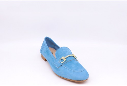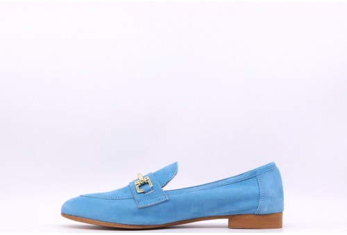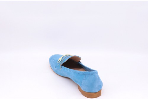 OVYE' MOCASSINO DONNA Ovyè mocassino color jeans in camoscio, accessorio oro, sottopiede in pelle e suola in gomma.