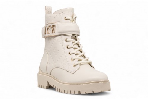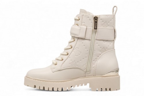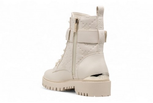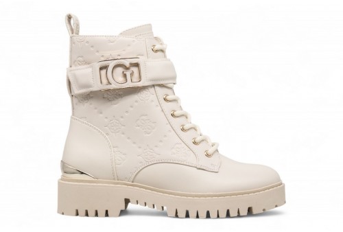 GUESS Anfibio Oranda 4G logo peony. Anfibio in simil pelle con logo peony impresso . Punta tonda. Scritta logo laterale, su retro e suola. Inserto laminato sul retro. COLORE: IVORY