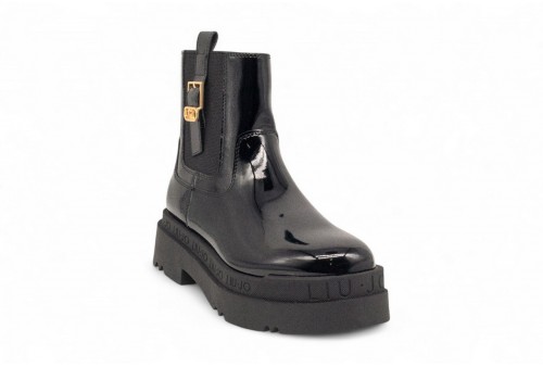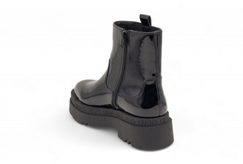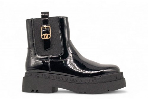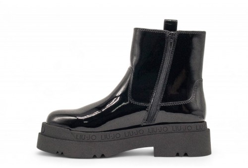 Stivaletti platform in vernice. Stivaletti con tomaia in vernice Chiusura con zip sul lato interno Inserto elastico Fibbia decorativa con logo monogram Suola platform con logo inciso.
