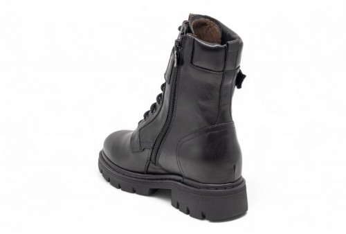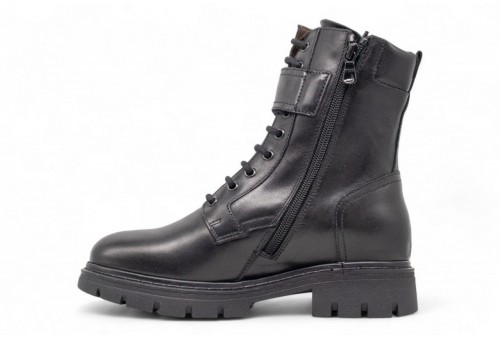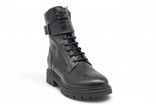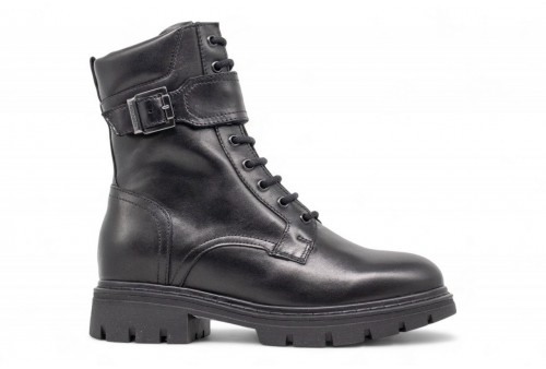 NERO GIARDINI anfibio donna in pelle. Anfibio realizzato in pelle nera con cinturino decorativo. Chiusura con zip e lacci. Fondo in gomma dentellato. COLORE: nero