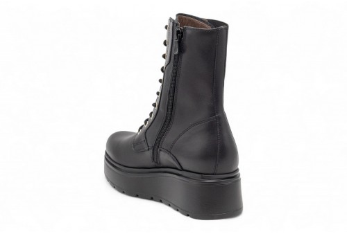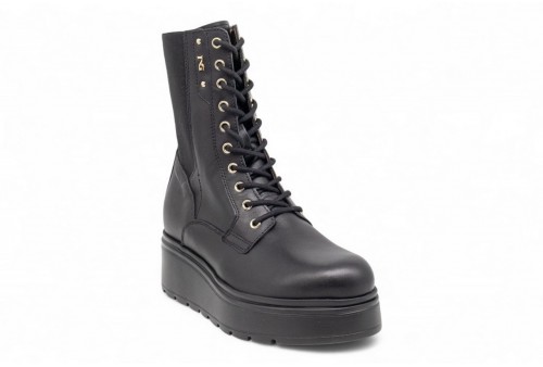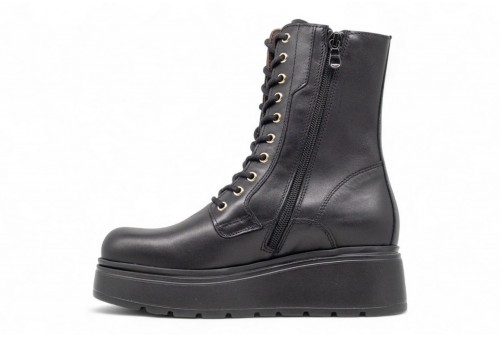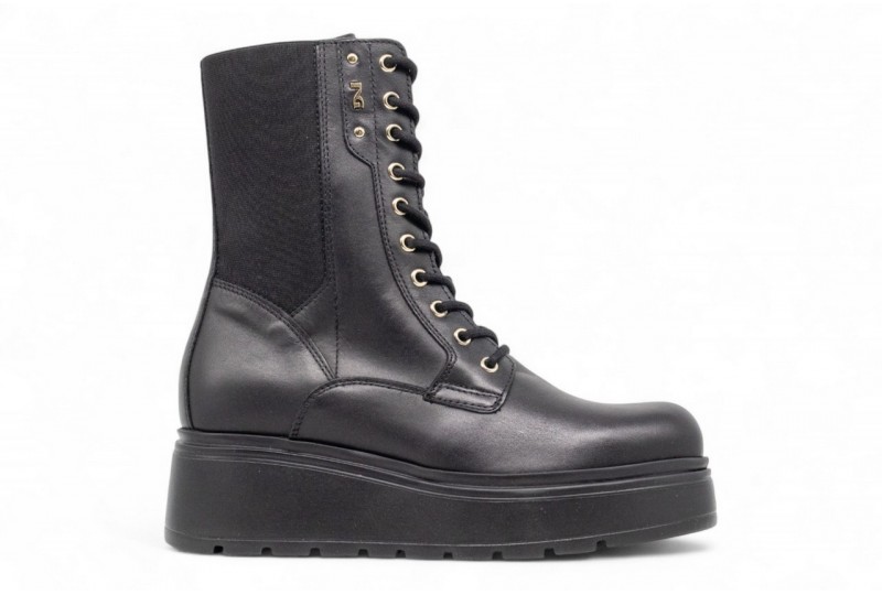 NERO GIARDINI anfibio in pelle. Anfibio con zeppa realizzato in pelle con dettaglio in tessuto lateral.Chiusura con zip . Fondo in gomma dentellato. COLORE: nero