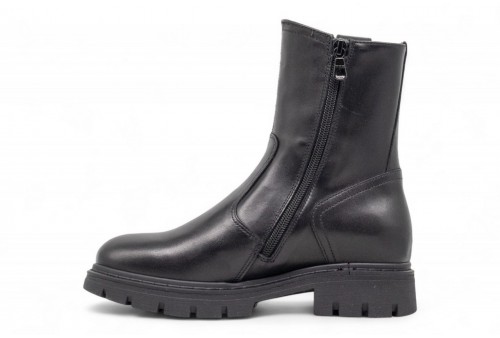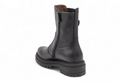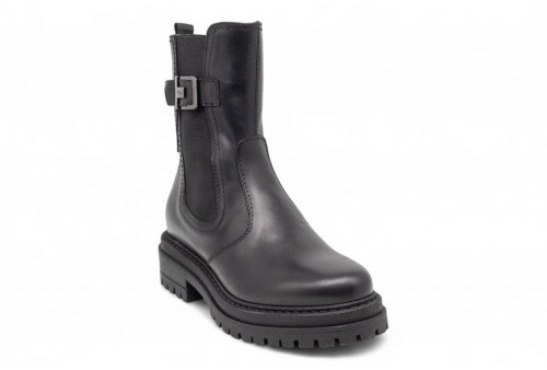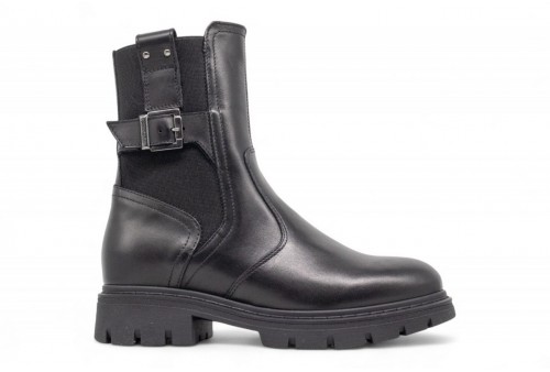 NERO GIARDINI biker in pelle. Stivaletto realizzato in pelle nera con cinturino decorativo. Inserto elastico laterale. Chiusura con zip. Fondo in gomma dentellato. COLORE: nero