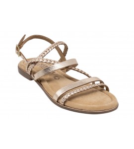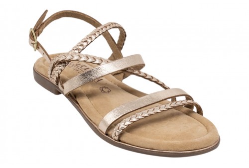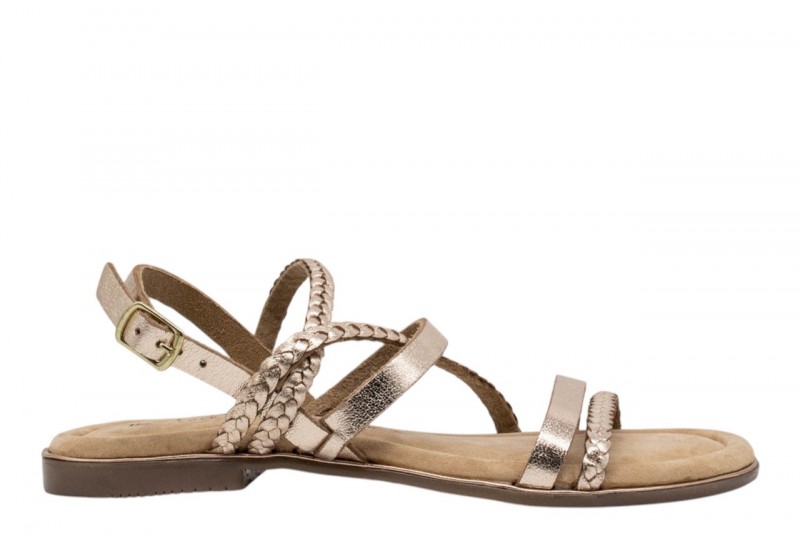 CARMELA sandalo flat 162385 S. PIEL ORO. Realizzato con un materiale che imita la pelle, con un elegante design intrecciato. Chiusura con cinturino con fibbia regolabile alla caviglia, garantendo una calzata sicura e confortevole.