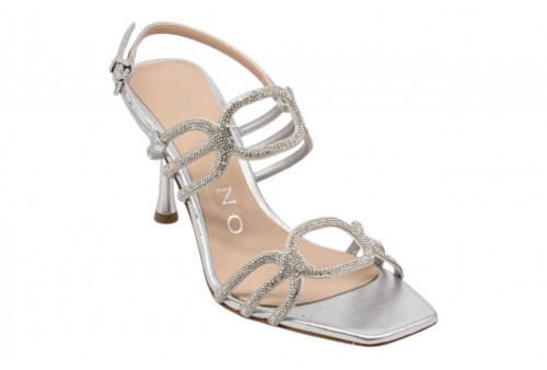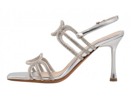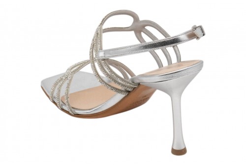 ALBANO sandalo 5530 SOFT ARGENTO. Sandalo tacco alto realizzato in pelle effetto laminato con listini impreziositi da strass. Chiusura con cinturino regolabile alla caviglia.