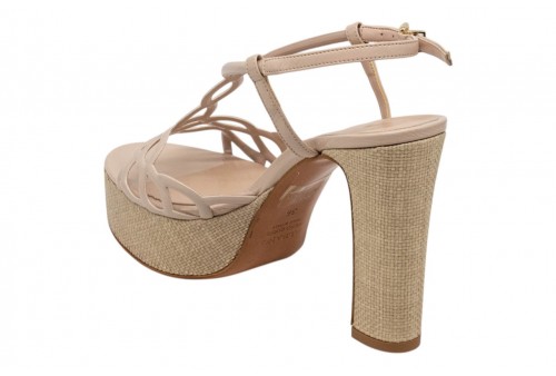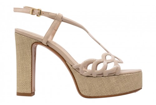 ALBANO SANDALO 5567 NAPLAK NUDE. Sandalo tacco alto con platform, realizzato in naplak nude con listini incrociati . Tacco rivestito in raffia. Chiusura con cinturino regolabile alla caviglia.