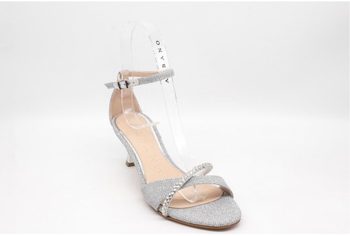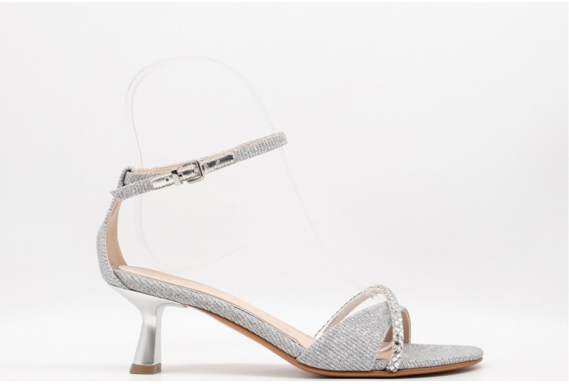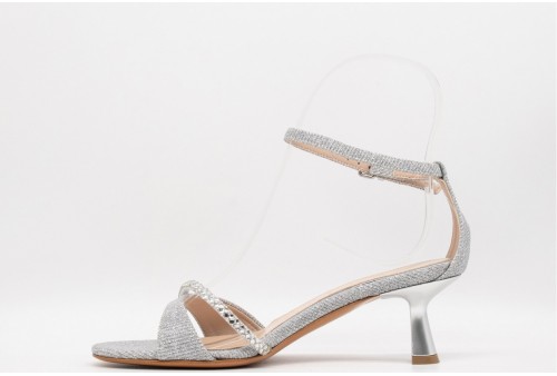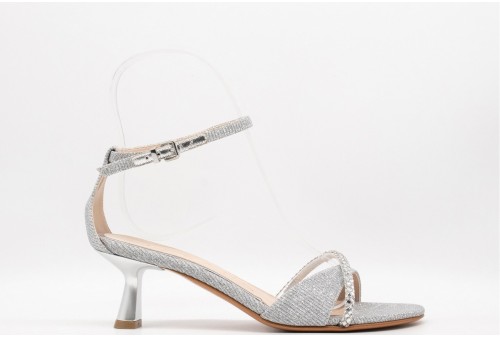 ALBANO Sandalo night argento. Sandalo basso in tessuto laminato della Linea Albano caratterizzato da cinturino alla caviglia e tacco a rocchetto effetto specchio.