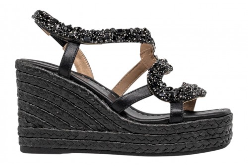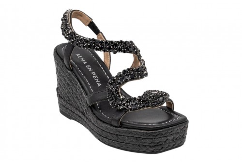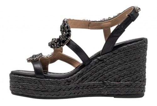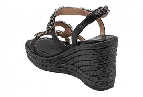 ALMA EN PENA sandalo con zeppa V266052 NAPA BLACK. Sandalo con zeppa in iuta realizzato in pelle e impreziosito da listini con applicazioni gioiello.Inserto elastico alla caviglia per facilitarne la calzata.
