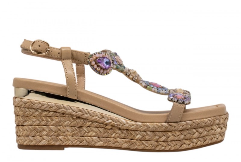 ALMA EN PENA sandalo con zeppa V266501 NAPA SAND. Sandalo con zeppa in iuta. Tomaia effetto scamosciato con applicazioni gioiello. Chiusura con cinturino regolabile alla caviglia.