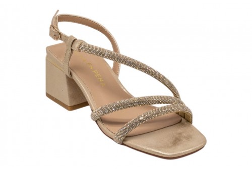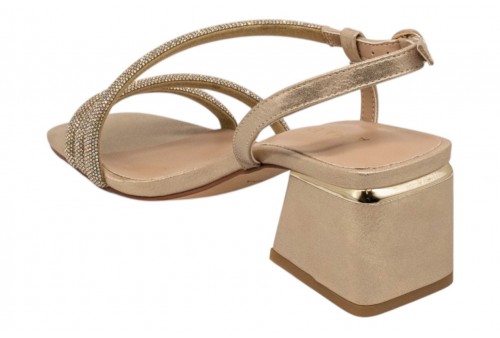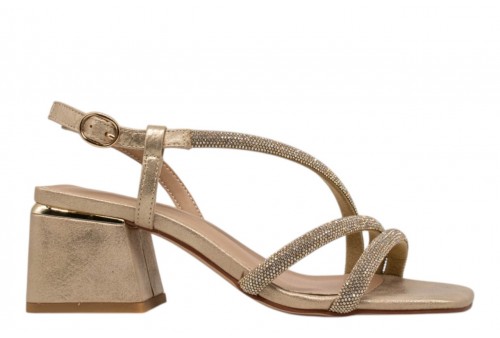 ALMA EN PENA V2650206 SARA GOLD. Sandalo realizzato in pelle e impreziosito da listini con strass. Chiusura con cinturino regolabile alla caviglia. Tacco a blocco.