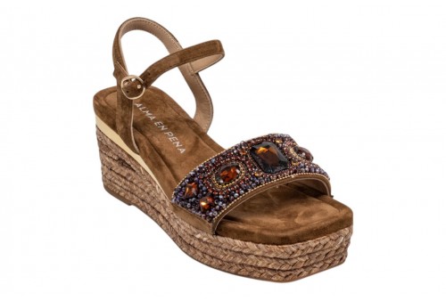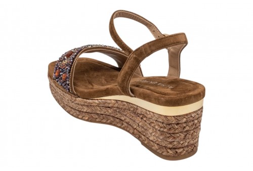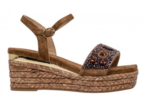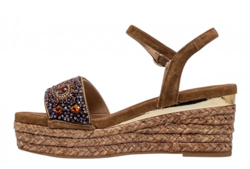 ALMA EN PENA V266502 SUEDE CARAMEL. Sandalo con zeppa in iuta realizzato in pelle scamosciata, fascia impreziosito da strass. Chiusura con cinturino regolabile alla caviglia.