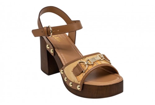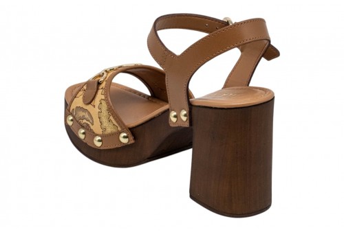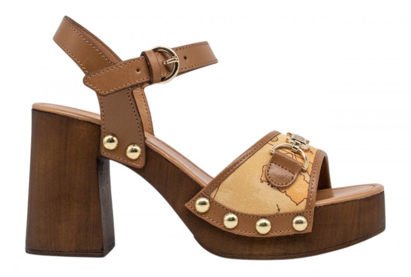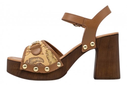 ALVIERO MARTINI sandalo 1395/431H/0010 NATURAL CO.La stampa Geo Classic viene esaltata dalla ricchezza dei dettagli di questi sandali: la fascia in reps è arricchita da dettagli in pelle liscia e chiodi dorati, mentre il fondo in poliuretano effetto legno con tacco svasato e punta quadra aggiunge carattere e un effetto armonioso. Il morsetto oro chiaro con logo 1? Classe aggiunge il tocco finale, rendendo il modello un vero must-have di stagione.