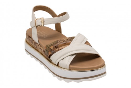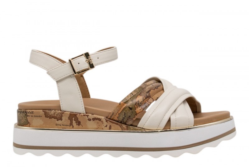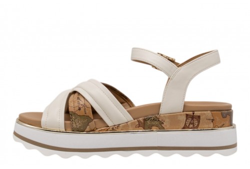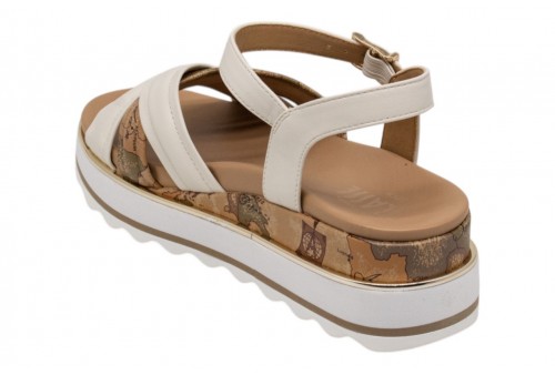 ALVIERO MARTINI sandalo 2469/0371/A630 WHITE/BEIGE GEO. Sandalo con zeppa realizzato in pu bianco con fascia a contrasto geo. Chiusura con cinturino regolabile alla caviglia.