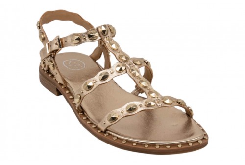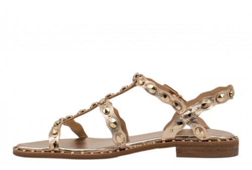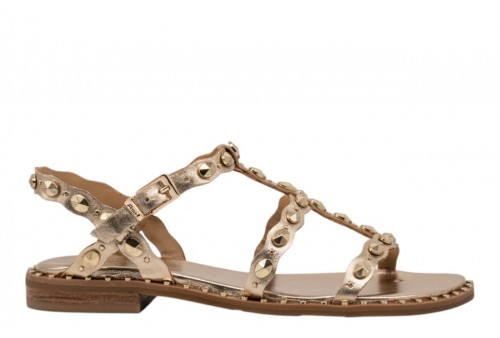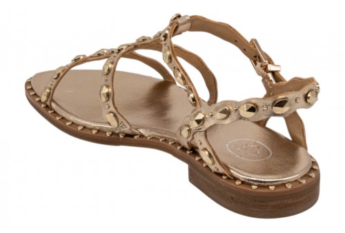 ASH sandalo PLUS SS26-M-152892-002 PLUS MEKONG. Sandalo flat realizzato in pelle laminata colorplatino con borchiette decorative. Chiusura con cinturino regolabile alla caviglia.
