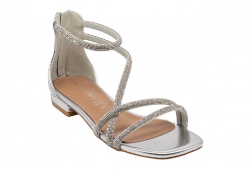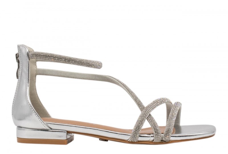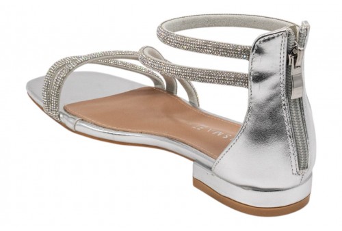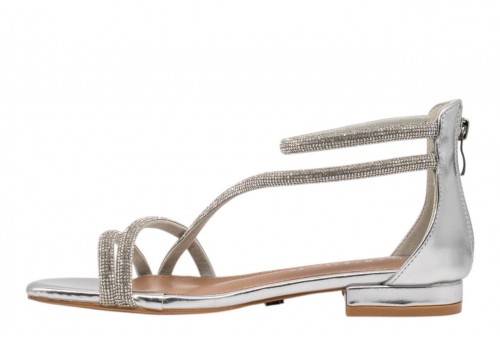 KHARISMA sandalo elegante 2305.26 LAMINATO ARGENTO. Sandalo elegante flat realizzato in PU impreziosita da listini con strass. Chiusura con zip al tallone.