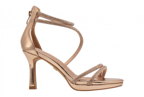 KHARISMA sandalo elegante 2605 LAMINATO rose gold.Sandalo elegante realizzato in PU caratterizzato da fasce impreziosite da micro strass che valorizza il piede con eleganza. Chiusura con zip al tallone che garantisce una calzata stabile e regolabile. Il tacco alto slanciato esalta la silhouette femminile.