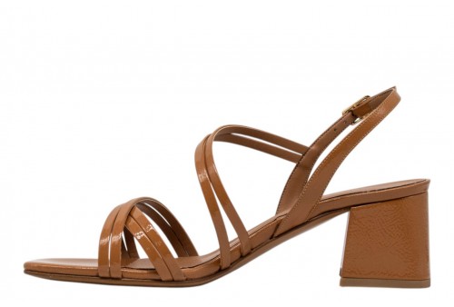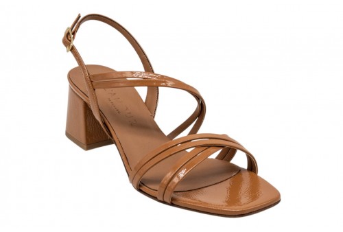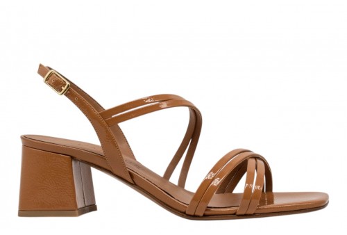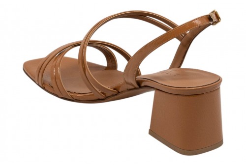 L'AMOUR L414 SANDALO NAPLAK CUOIO. Sandalo realizzato in pelle naplak, effetto vernice, caratterizzato da listini incrociati. Chiusura con cinturino con fibbia regolabile alla caviglia. Tacco a blocco.