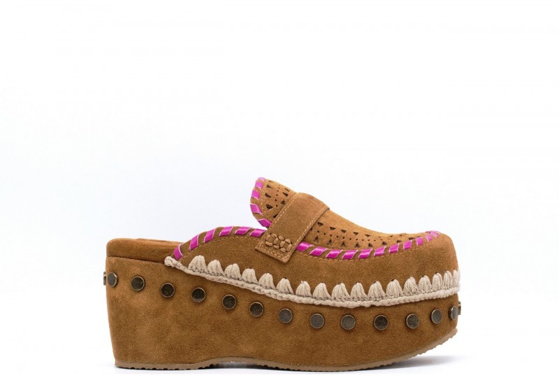 MOU Clog leather overstitch. Realizzato a mano in vera pelle di camoscio con le cuciture all'uncinetto distintive delle eskimo mou e borchie in metallo. La suola leggera è stata rifinita con una soletta imbottita in camoscio per un comfort ancora maggiore. Altezza zoccolo 6.7cm.