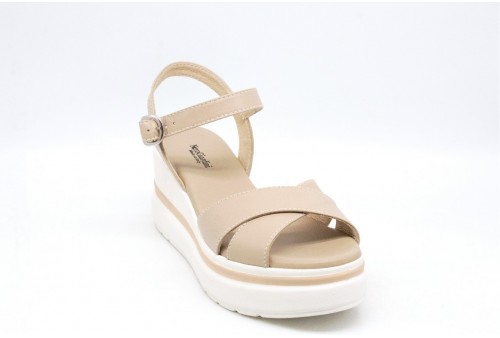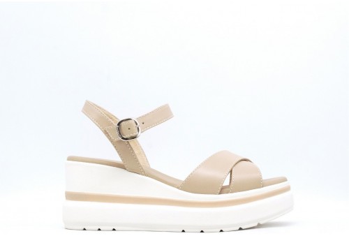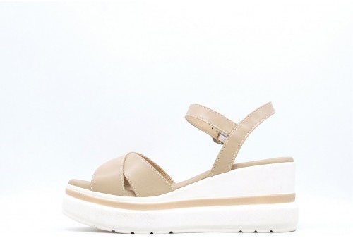 NERO GIARDINI SANDALO CON ZEPPA. Sandalo con zeppa realizzato in pelle liscia con fasce incrociate. Chiusura con cinturino con fibbia alla caviglia . COLORE: lino
