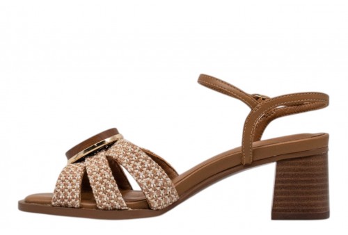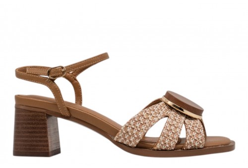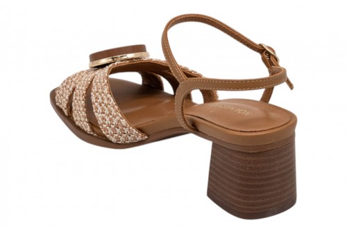 NOA HARMON SANDALO CARMEN 10287-M07 TAN. Sandalo realizzato in pelle con accessorio frontale. Fascette incrociate in tessuto intrecciato bicolore. Tacco a blocco.