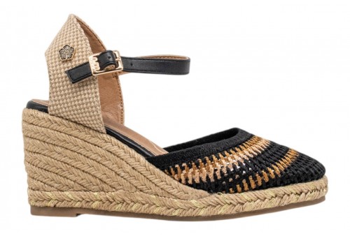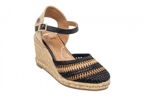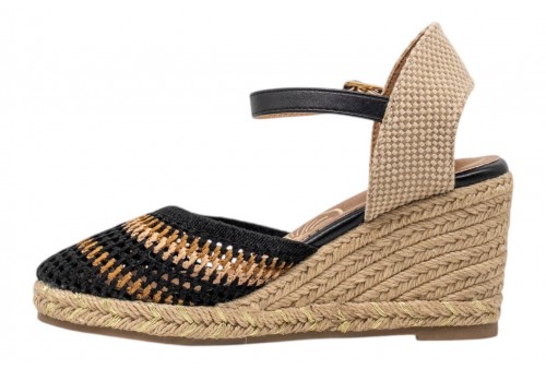 O-JOO sandalo con zeppa OL61530A GERI CROCHET BLACK. Sandalo con zeppa in iuta realizzato in Pu con punta chiusa in tessuto intrecciato multicolor.Chiusura con cinturino regolabile con fibbia alla caviglia.