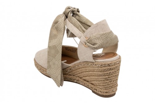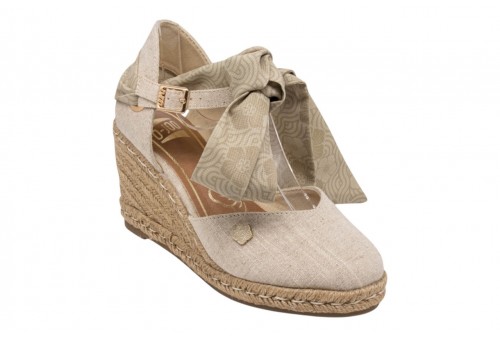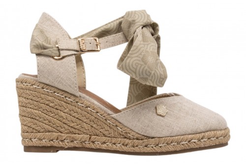 O-JOO sandalo con zeppa OL61531A GERI CVS BEIGE. Sandalo con zeppa in iuta realizzato in tessuto con punta chiusa. Foulard decorativo alla caviglia. Chiusura con cinturino regolabile con fibbia alla caviglia.