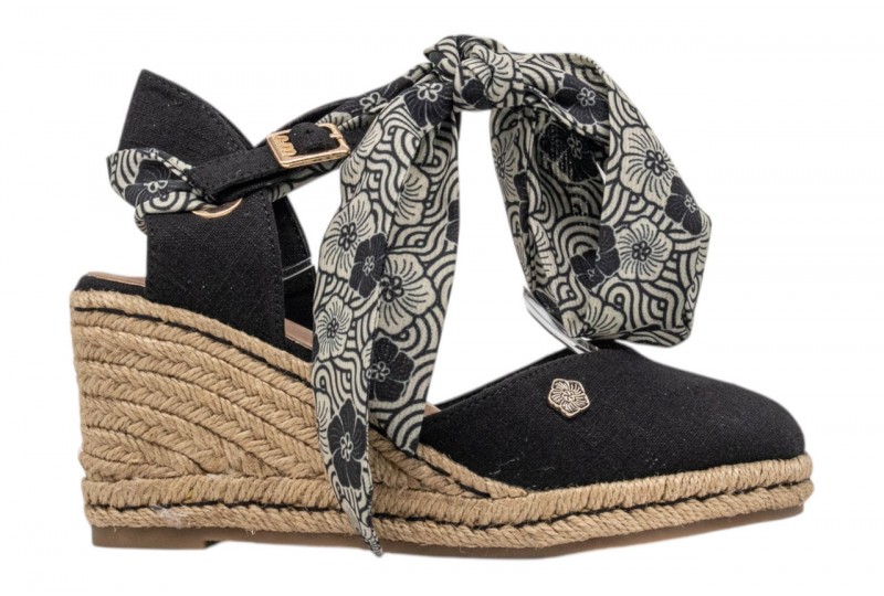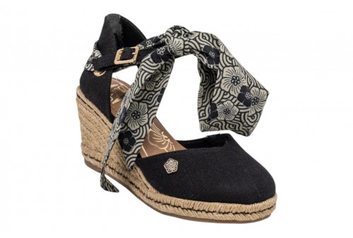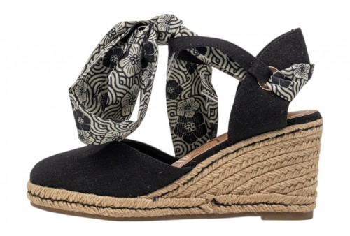 O-JOO sandalo con zeppa OL61531A GERI CVS black. Sandalo con zeppa in iuta realizzato in tessuto con punta chiusa. Foulard decorativo alla caviglia. Chiusura con cinturino regolabile con fibbia alla caviglia.