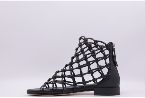 VIC MATIE' Tronchetto flat intrecciato. Tronchetto flat intrecciato nero interamente realizzato da mignon in ecopelle annadotati fra loro, toppone in pelle e zip posteriore per facilitare la calzata, fondo in cuoio e sottopiede in pelle.