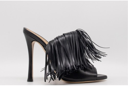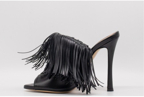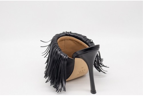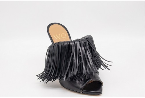 WO MILANO SANDALO CON FRANGE. Sandalo a punta con fascia realizzato in pelle liscia. Frange in pelle nera decorative. Tacco rivestito in pelle.