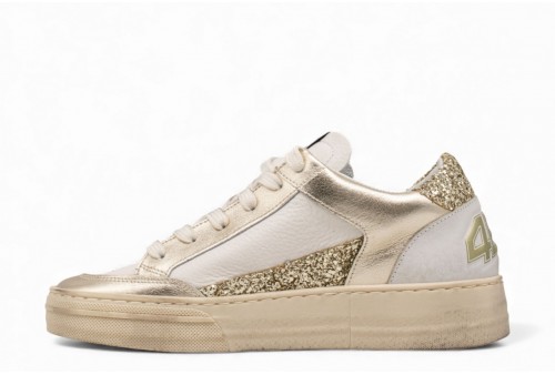 4B12 DONNA SNEAKER KYLE. Sneakers realizzata in pelle di colore bianco con dettagli platino. Caratterizzata da inserti glitterati. Logo al tallone. Linguetta con label logata.