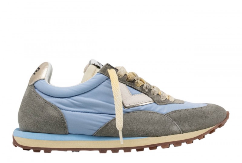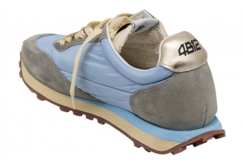 4B12 DONNA VINTAGERUND13001 LIGHT BLUE. Sneakers 4B12 donna In tessuto azzurro con dettagli in pelle scamosciata sui toni del grigio. Spoiler in pelle laminata. La Vintage Run è progettata per chi cerca una scarpa estremamente leggera e confortevole, perfetta per affrontare le giornate dinamiche in città senza rinunciare a un look curato. La struttura multimateriale e la silhouette affusolata richiamano le grandi icone dell'atletica degli anni '70 e '80.