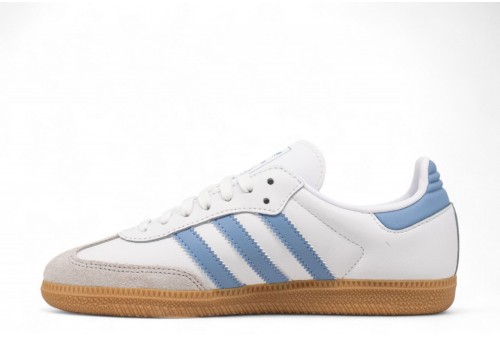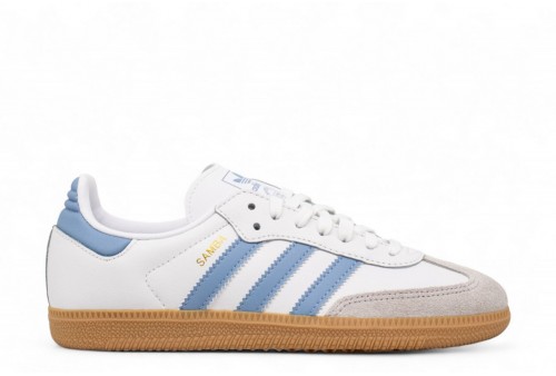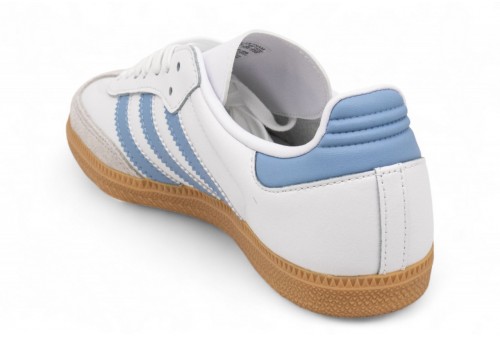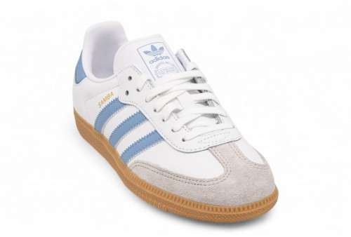 ADIDAS SAMBA Sneakers OG UNISEX, nate sui campi da calcio indoor, le Samba sono un'intramontabile icona streetstyle. Questa versione con tomaia in morbida pelle e rivestimenti in suede resta fedele al design originale. COLORE: WHT/ashblu/gum