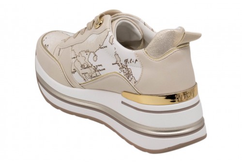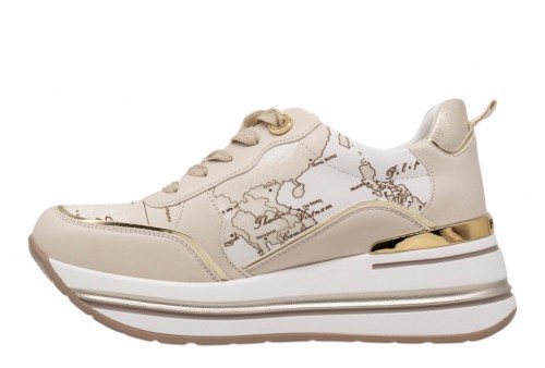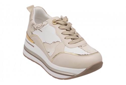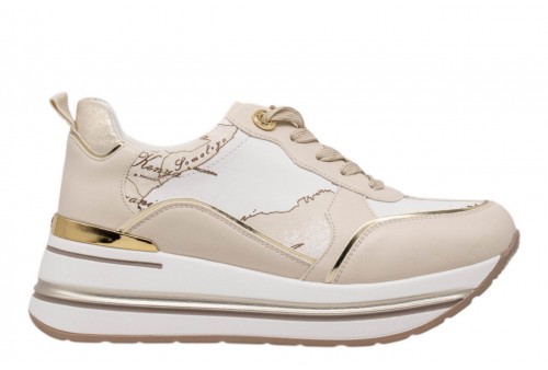 ALVIERO MARTINI donna sneaker 1479/752F/0900 WHITE. Sneaker modello running realizzata in pu.Tomaia con inserti in ecopelle geo. Spoiler beige. Inserti laminati dorati.