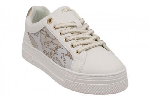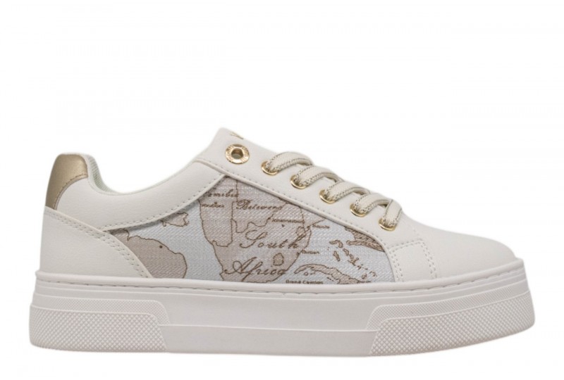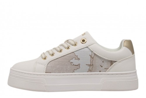 ALVIERO MARTINI donna sneaker 2415/0558/X018 WHITE/SAFARI GEO. Sneaker platform realizzata in pu bianca. Tomaia con inserti in ecopelle geo. Spoiler dorato. Linguetta con logo dorato.