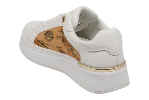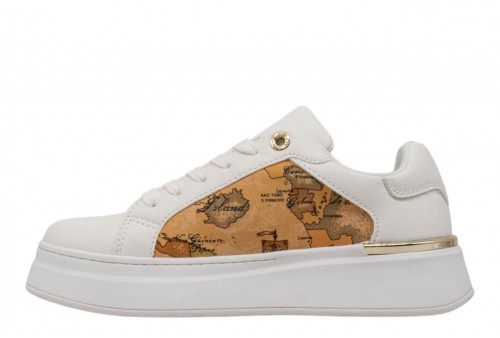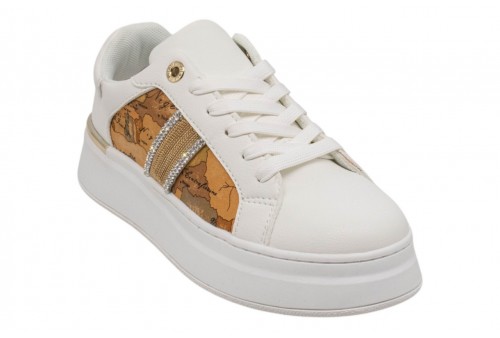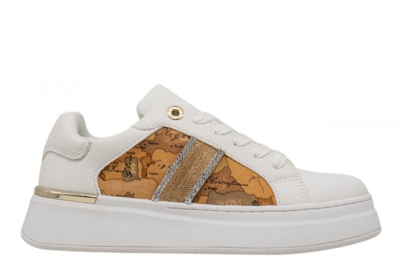 ALVIERO MARTINI DONNA SNEAKER 2424/0208/X013 WHITE/BEIGE. Sneaker realizzata in eco pelle liscia bianca con dettaglio cartina geo laterale in tessuto. Punta rotonda. Dettaglio strass. Spoiler in PU tono su tono. Fondo bold.