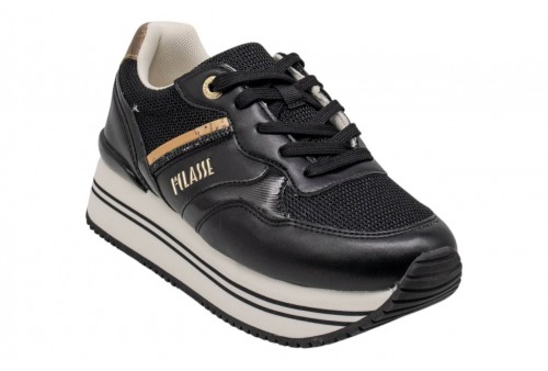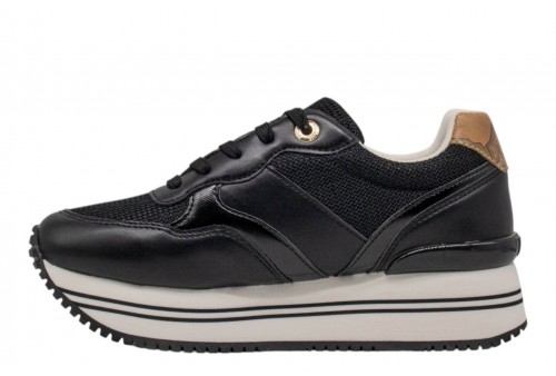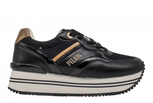 ALVIERO MARTINI DONNA SNEAKER 2441/0558/X550 BLACK/GEO BEIGE . Sneaker realizzata in eco pelle liscia nera con dettaglio strass e inserti in tessuto. Logo lettering laterale. Spoiler geo beige/laminato platino. Linguetta a contrasto geo beige. Fondo platform in gomma.
