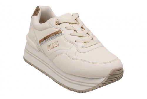 ALVIERO MARTINI SNEAKER DONNA 2439/0289/A630 WHITE/GEO BEIGE . Sneaker realizzata in eco pelle liscia bianca con dettaglio strass. Logo lettering laterale. Spoiler geo beige. Fondo platform in gomma.