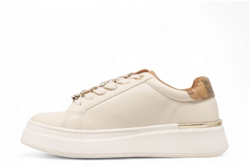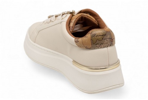 ALVIERO MARTINI SNEAKERS DETTAGLIO GIOIELLO. Sneakers realizzata in eco nappa con spoiler geo leather.Linguetta stampa geo leather. Passalacci gioiello. Fondo platform. COLORE: off white