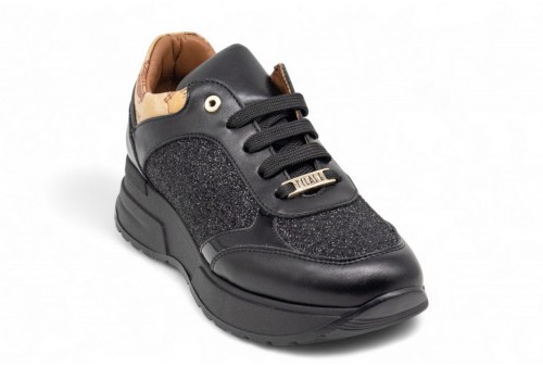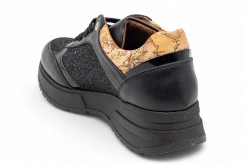 ALVIERO MARTINI SNEAKERS GLITTER. Sneakers realizzata in pelle liscia nera con inserti glitterati tono su tono. Spoiler stampa geo leather. Colletto imbottito. COLORE: nero