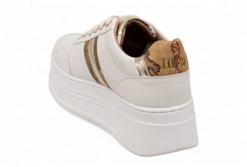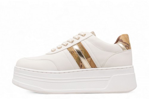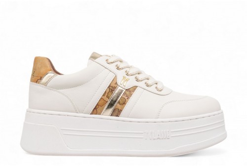 ALVIERO MARTINI SNEAKERS PLATFORM. Realizzata in tessuto effetto nappa. Il modello si arricchisce del logo 1C in microiniezione sul lato e del dettaglio con stampa Geo Classic al lato e sul tallone, rifinito dall'inserto in tessuto laminato e dal logo 1? Classe. COLORE: BIANCO