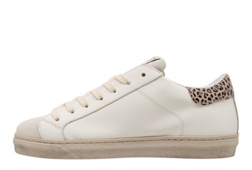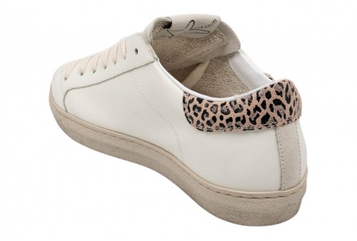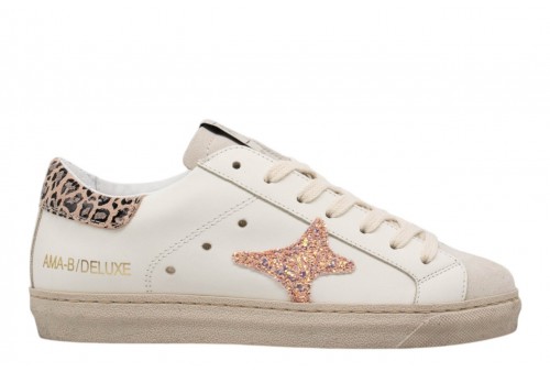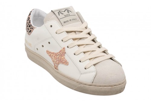 AMA BRAND donna sneaker 4502 SNK BIANCO. Sneaker low cut realizzata in pelle bianca con inserto in suede.Logo laterale glitterato. Spoiler in pelle effetto maculato. Linguetta con Label logata. Chiusura con stringhe.