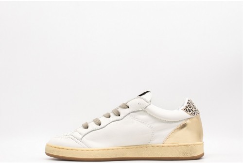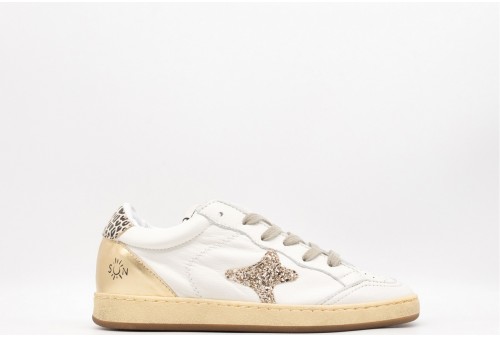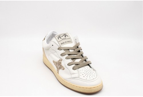 AMA BRAND SNEAKER 4115 SUN. Sneakers realizzata in pelle con logo laterale in glitter oro e talloncino in pelle stampata animalier. Dettagli in pelle laminata oro al tallone. Colore: Bianco/oro Tomaia: Pelle Fodera: Pelle Sottopiede: Pelle Fondo: Gomma Altezza: 2.5 cm Chiusura: con Stringhe Collezione: Primavera/Estate Codice: 4115-bo