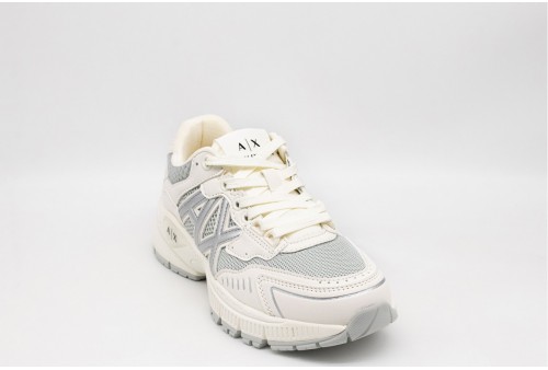 ARMANI EXCHANGE SNEAKER RUNNING. Sneaker modello running realizzata in ecopelle con maxi logo laterale. Inserti in tessuto. Linguetta con logo . COLORE: BIANCO/ARGENTO