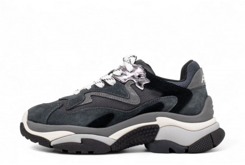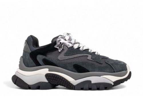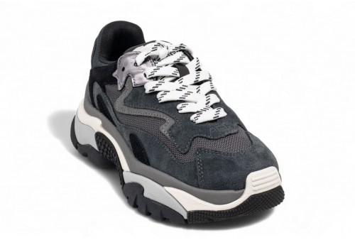 Ash Sneakers Addict 01 . Sneaker realizzata in pelle scamosciata e tessuto tecnico. Dettagli multistrato e finiture a contrasto. Lacci striati in cotone. Interno in spugna morbida. Fussbett estraibile da 2 cm. Suola chunky in gomma dal design massiccio. Altezza tacco 6 cm. Punta arrotondata. COLORE: GREYSTONE/BLK